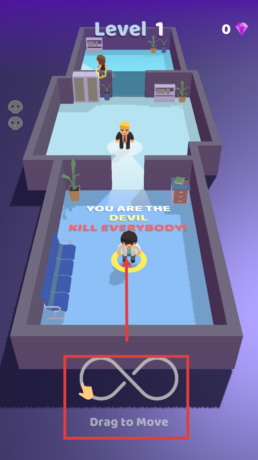 2、作为恶魔,按照【Drag-to-Move】的提示,拖动角色在场景中移动,寻找可击杀的目标。