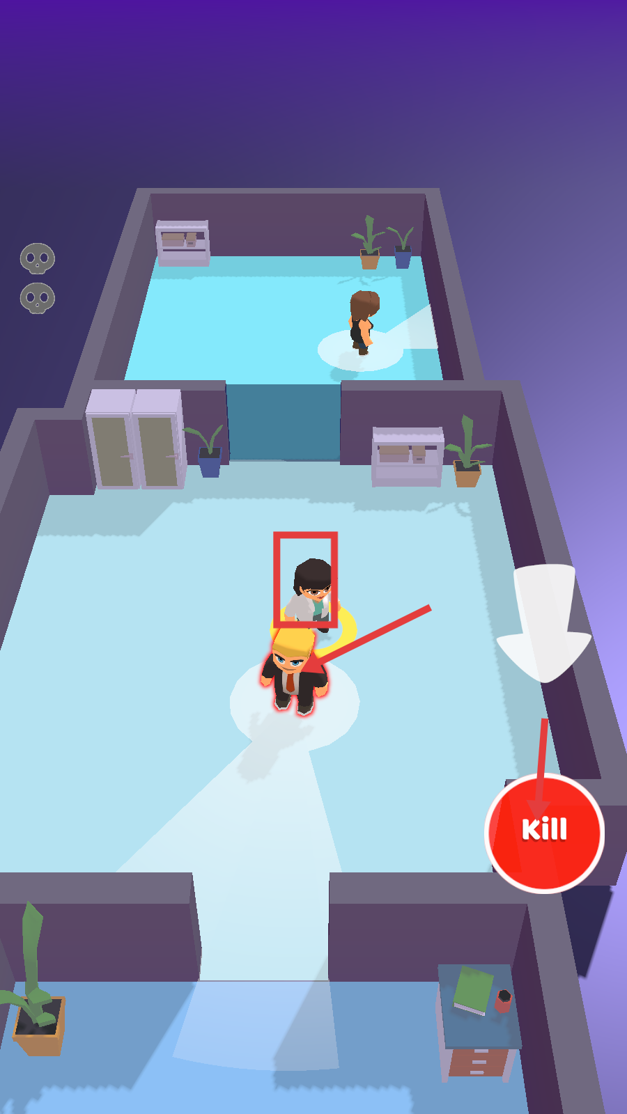 3、靠近场景中的人物目标后,点击右侧红色【kill】按钮,对目标执行击杀操作,推进关卡进度。