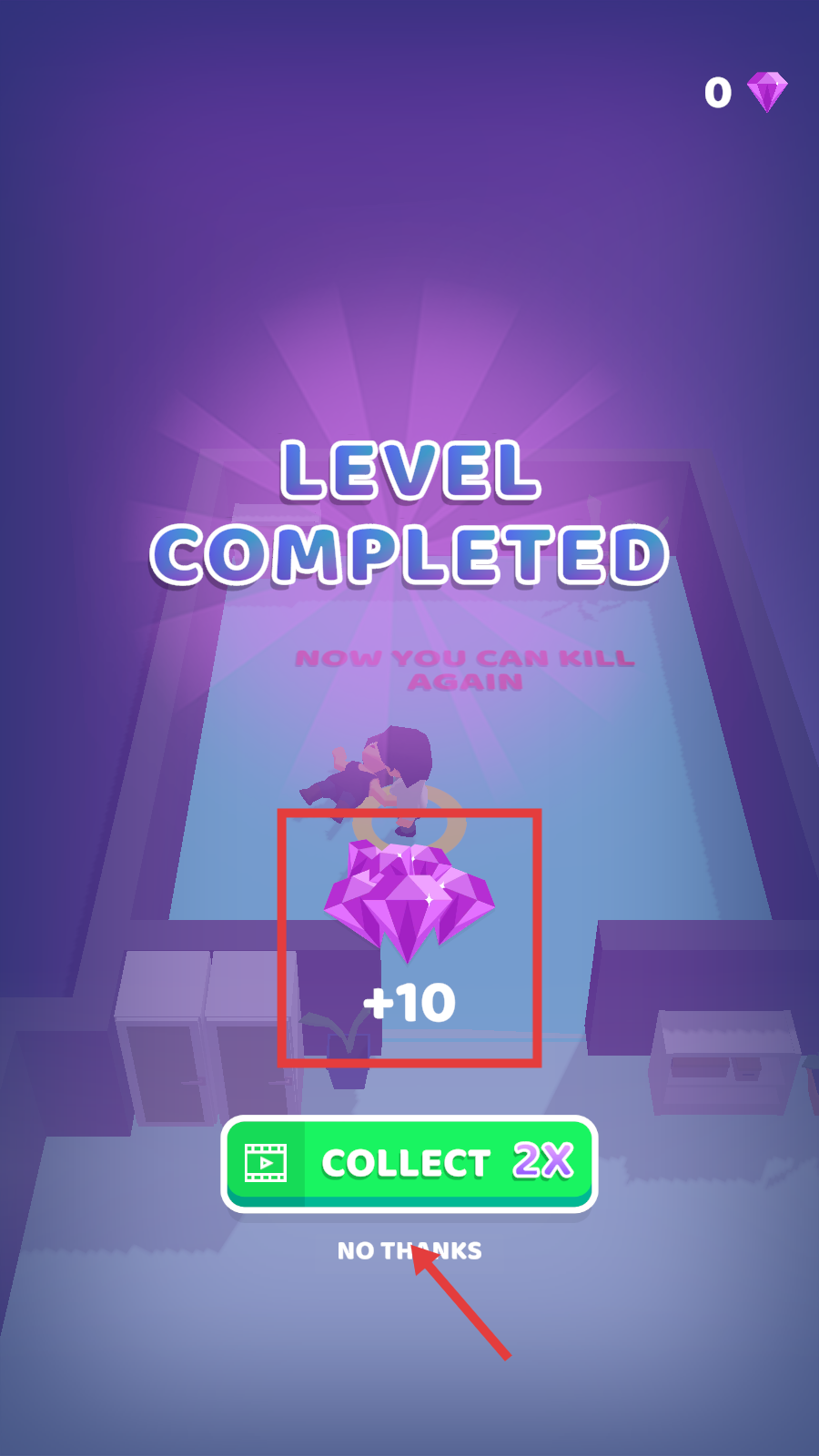 4、成功击杀所有目标后,关卡完成(Level-Completed),可获得【+10】钻石奖励,选择“NO-THANKS”或“COLLECT-2X”领取奖励。