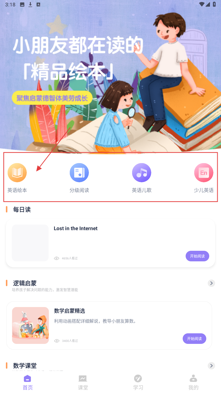 1、进入应用首页,有【英语绘本】【分级阅读】等分类,可根据需求选分类开启学习。