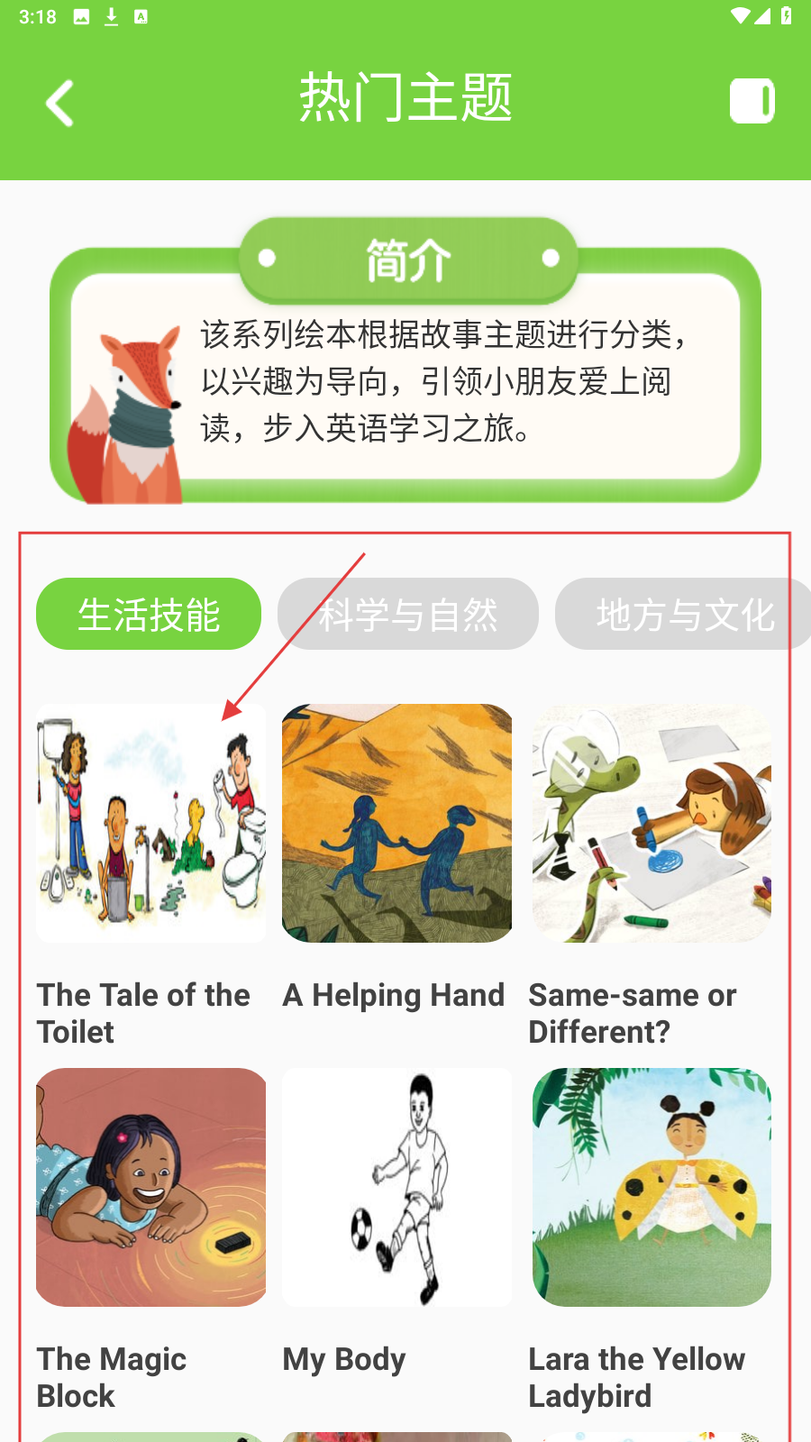 2、选【英语绘本】分类后,进入热门主题页,有【生活技能】等主题,挑感兴趣的绘本主题。