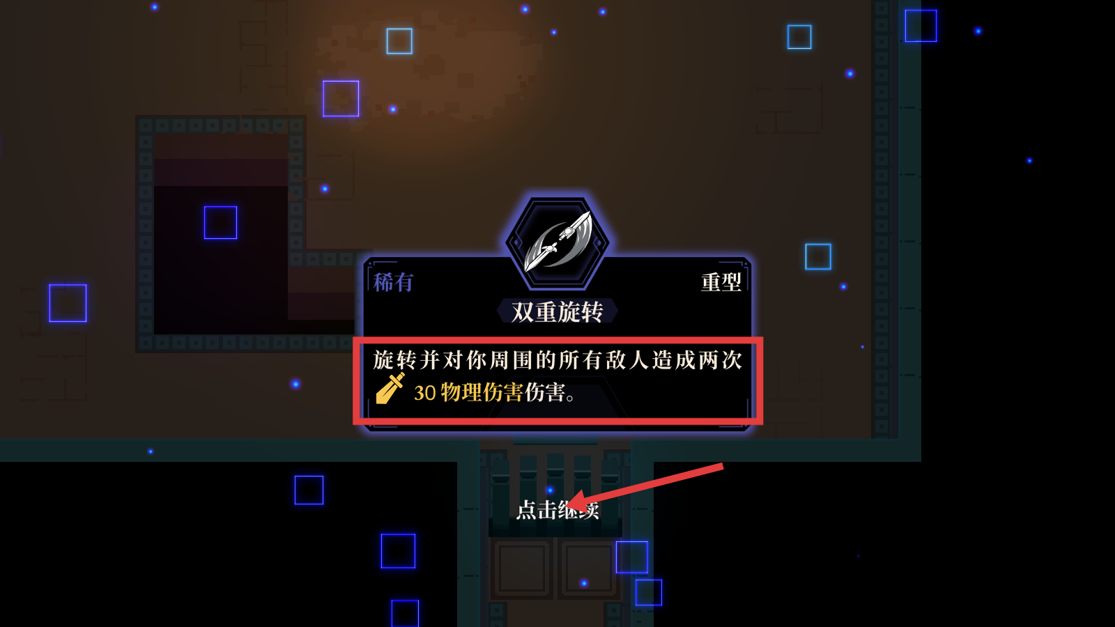 3、解锁【双重旋转】技能,它能旋转并对周围所有敌人造成两次30物理伤害,点击【点击继续】,继续游戏流程。