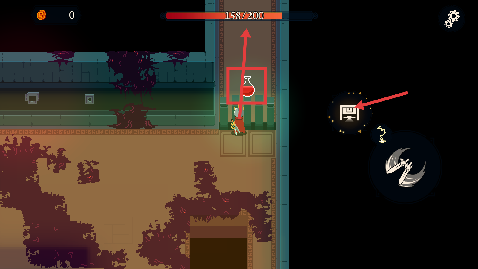 4、在场景中拾取红色血瓶,可恢复生命值(如从158/200往200恢复),也可利用右侧传送类图标,实现场景内的移动或传送。