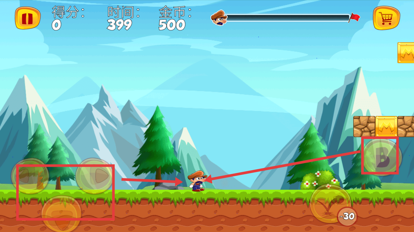 2、在场景中用左侧按钮控制角色移动,点击右侧【B】键,与场景元素互动或发起行动。