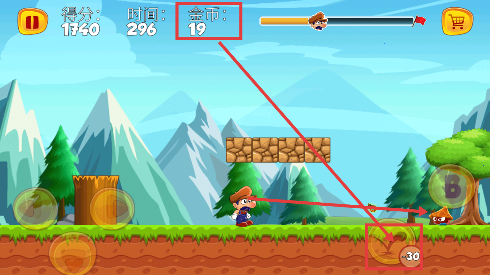1、基础闯关操作:顶碎砖块获取金币,踩踏怪物突破障碍,抵达旗杆完成关卡目标。