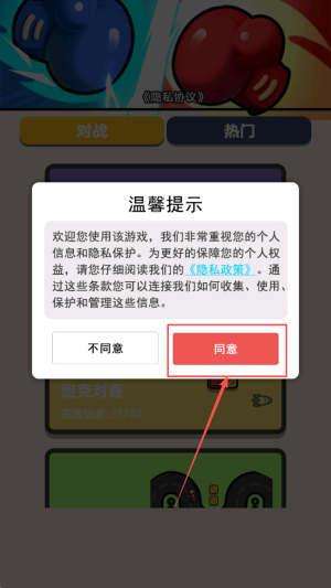1、阅读温馨提示,点击“同意”进入游戏。