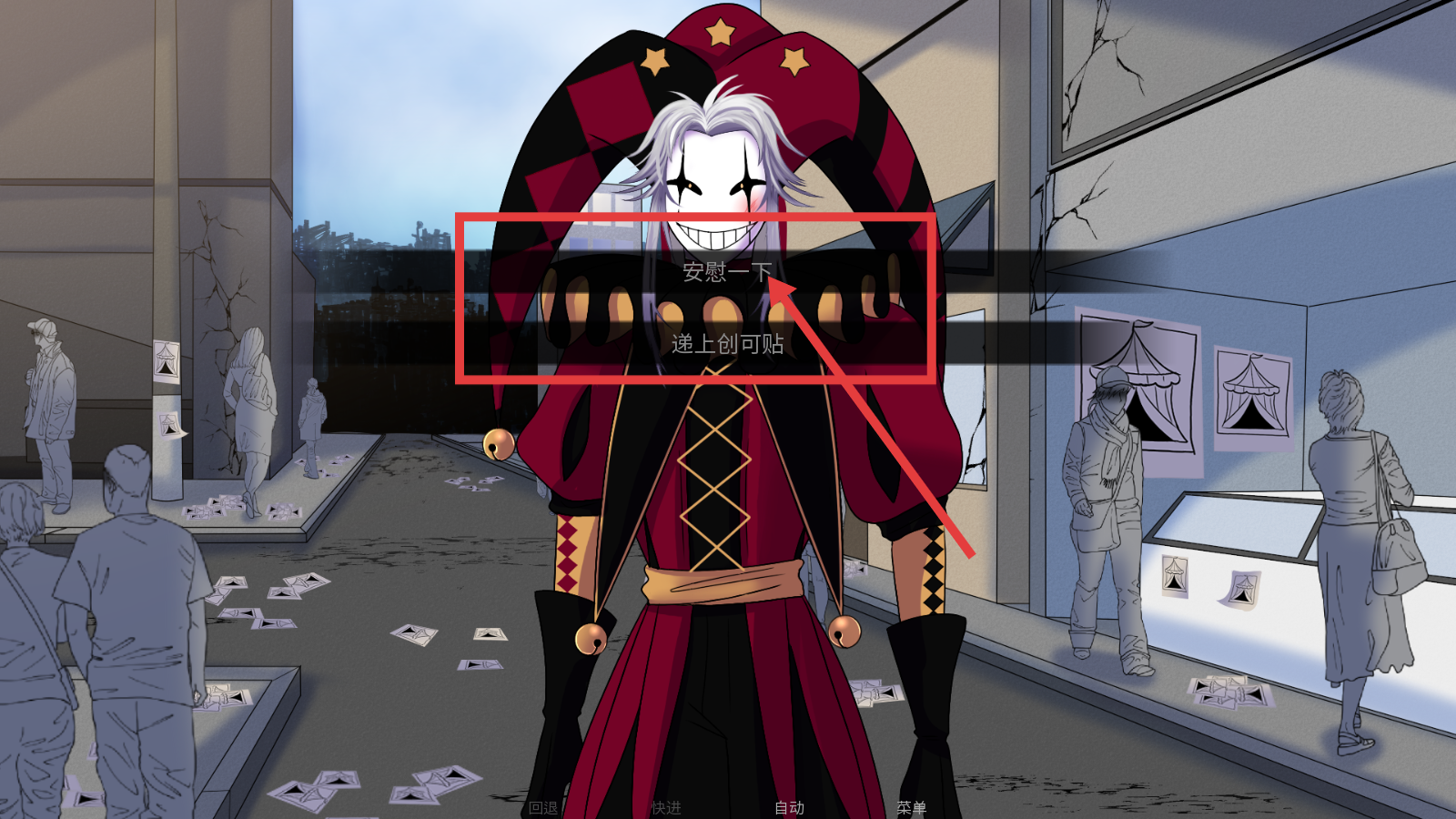 3、遇到小丑模样角色时,可选择【安慰一下】或【递上创可贴】,不同选择会影响后续剧情。
