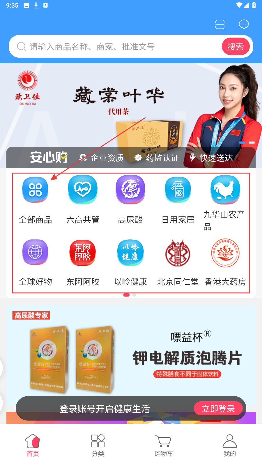 1、进入应用首页,有【全部商品】【六高共管】等分类,可根据需求选分类找商品。