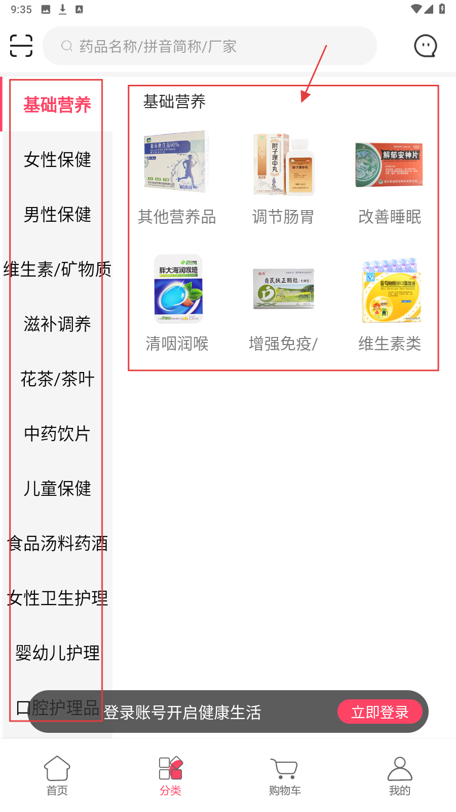 3、进入分类页,有【基础营养】【女性保健】等分类,选【基础营养】分类,可看到“其他营养品”“调节肠胃”等细分商品。