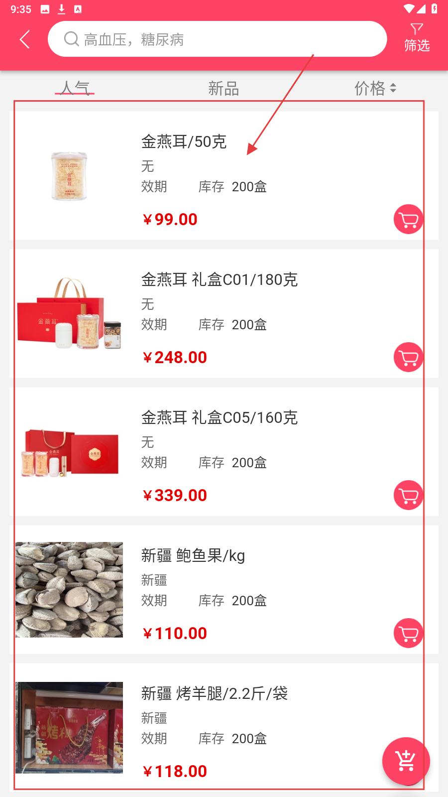 4、在商品列表中,可挑选“金燕耳”“新疆鲍鱼果”等健康商品,查看详情后加入购物车购买。