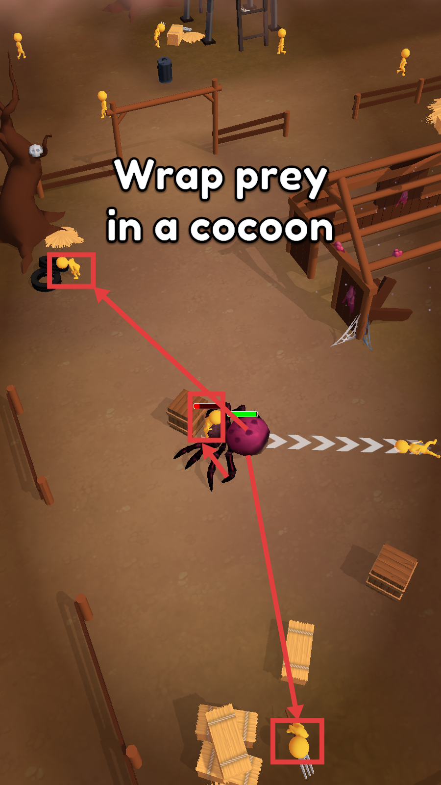 2、成功捕获人类后,要将猎物包裹进茧中,注意红色箭头指引的目标,完成【Wrap-prey-in-a-cocoon】的操作。