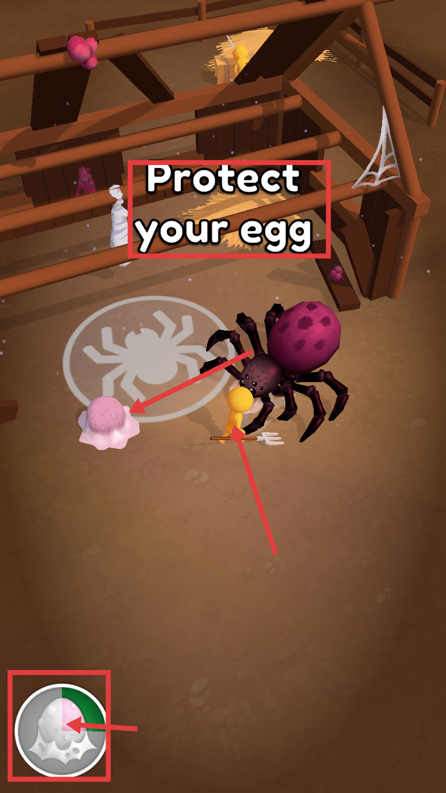 4、最后要保护好蜘蛛卵,抵御拿着工具的黄色小人的攻击,关注左下角状态提示,完成【Protect-your-egg】的守护任务。