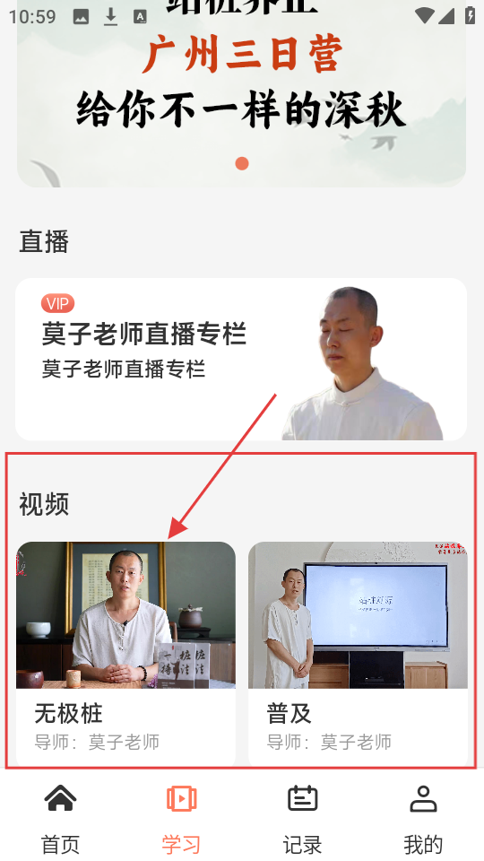 3、进入学习板块,可选择“莫子老师直播专栏”或“无极桩”等视频学习站桩知识。