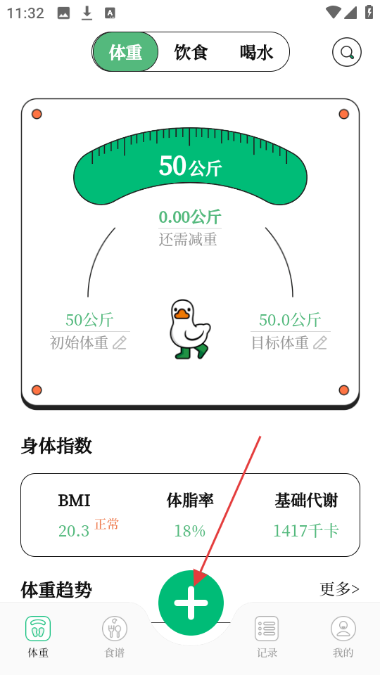 1、进入应用,在【体重】页面查看身体指数,点击下方“+”号记录健康数据。