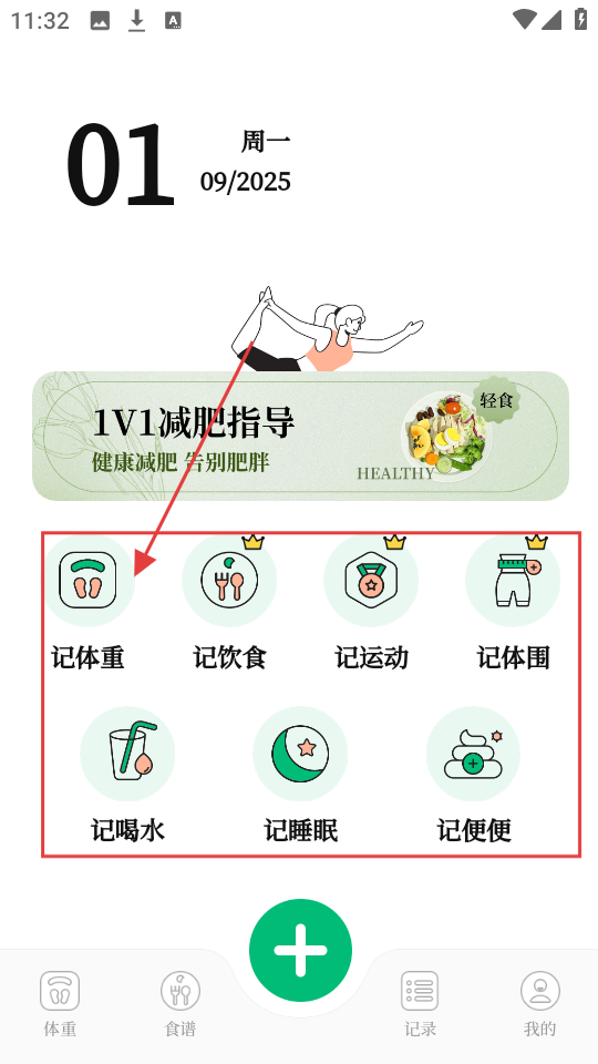 2、在记录页面,使用【记体重】【记饮食】等功能记录相关信息。