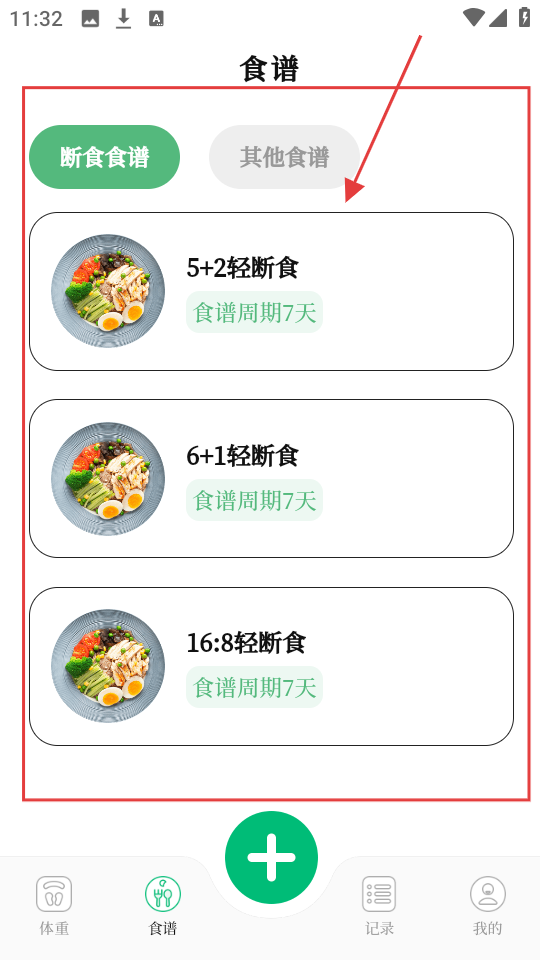 3、进入【食谱】页面,有【5+2轻断食-食谱周期7天】等断食食谱,可选择合适的。