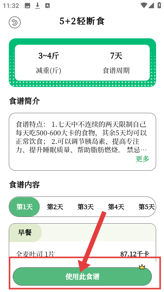 4、以【5+2轻断食】为例,查看信息后,点击【使用此食谱】,按食谱饮食。