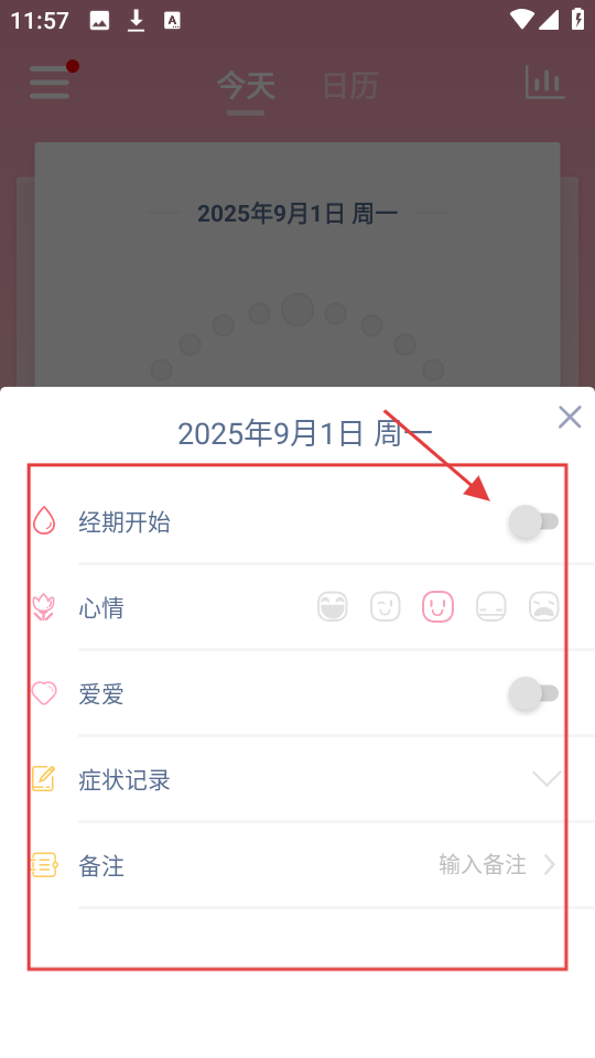 2、在记录界面,可设置【经期开始】开关,选择心情,还能记录“症状”等,添加备注。