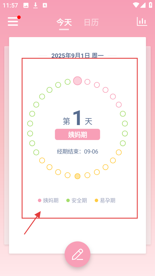 1、进入应用,在日期页面点击下方粉色铅笔图标,开始记录经期相关信息。