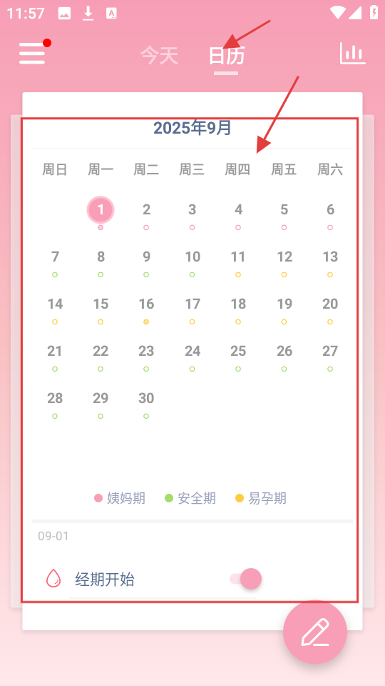 4、切换到【日历】页面,可查看整个9月的经期、安全期、易孕期分布,方便规划日程。