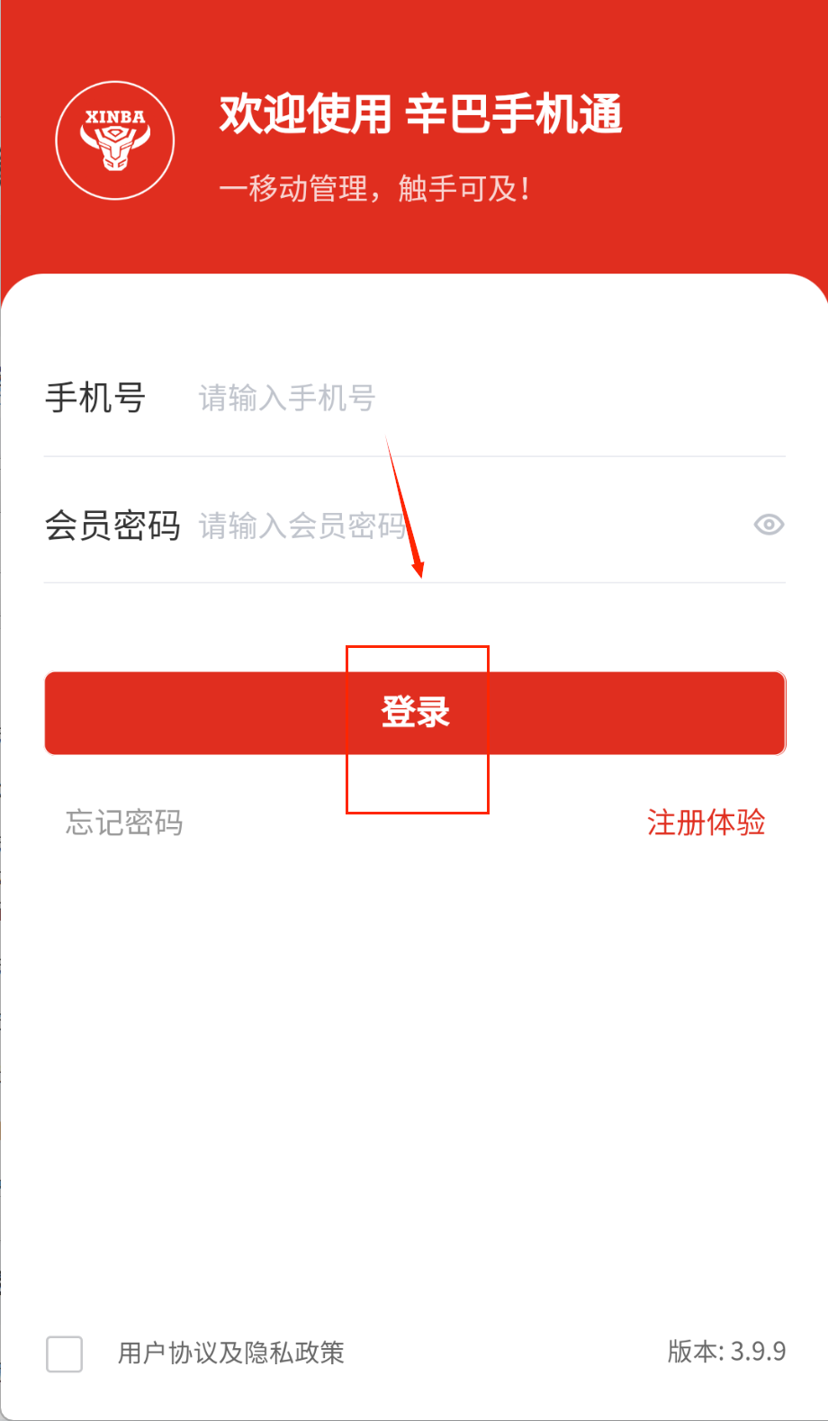 1、打开软件首先会看到登录界面,在白色输入框里填写手机号和会员密码,点击红色登录按钮就能进入主界面,忘记密码点下方链接找回哦。