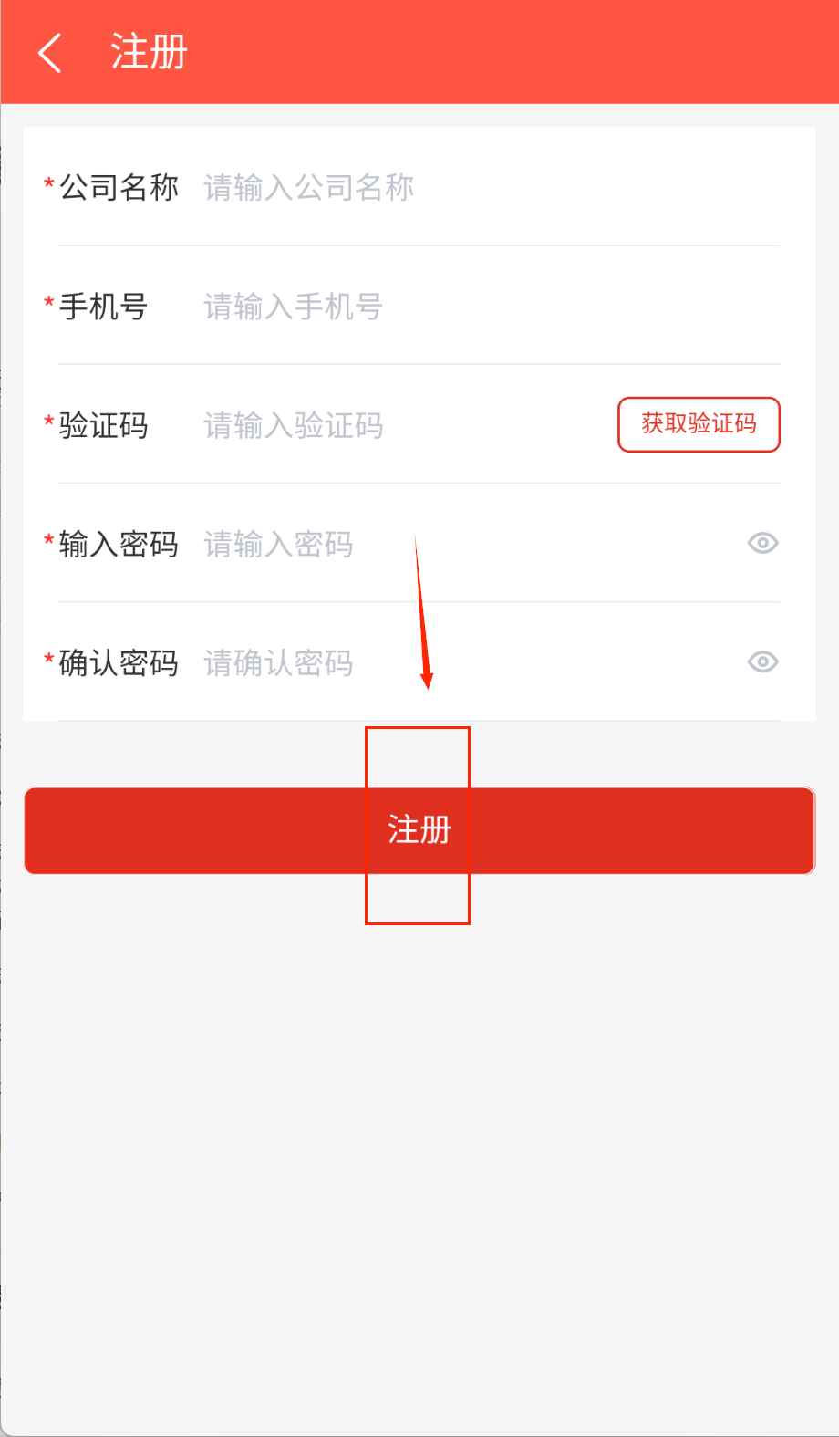 2、新用户需要点击注册体验按钮,依次填写公司名称、手机号并获取验证码,设置好密码后点击红色注册按钮就能创建账户啦。