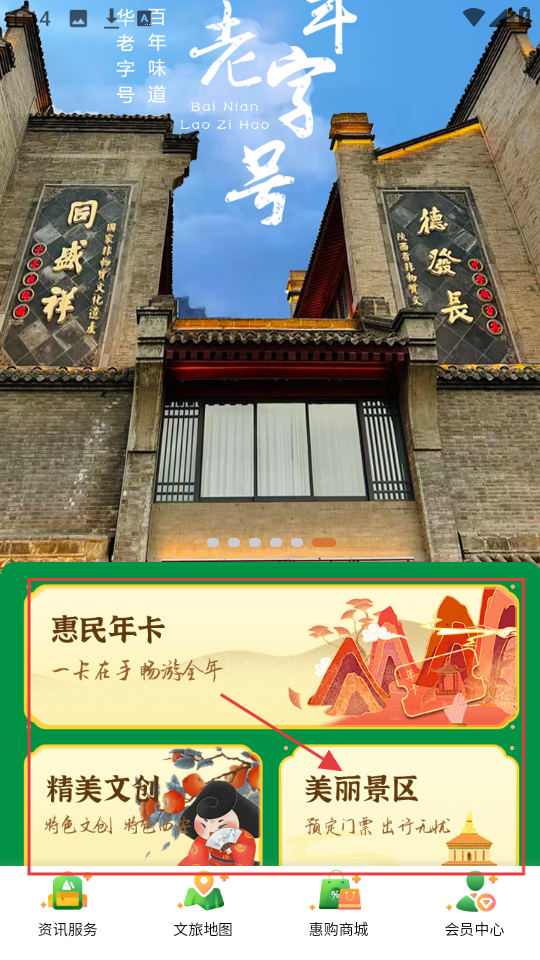 1、进入应用,可选择【惠民年卡】【精美文创】【美丽景区】等板块,开启文旅相关体验。