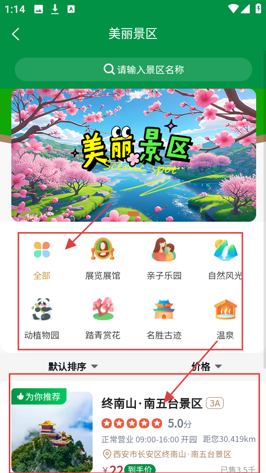 2、进入【美丽景区】板块,有【全部】【展览展馆】等分类,还能看到“终南山南五台景区”等推荐景区。