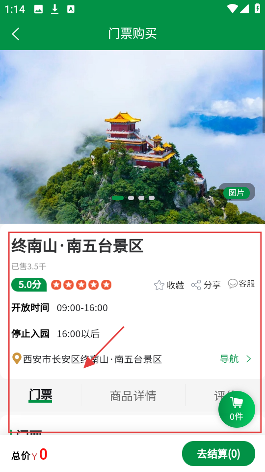 3、点击“终南山南五台景区”,进入门票购买页面,查看开放时间、停止入园时间等,可进行门票购买。