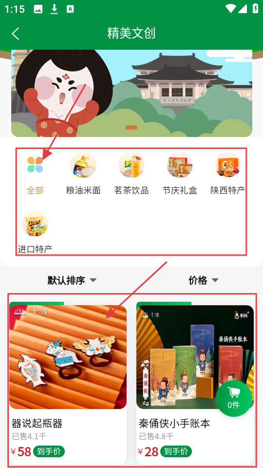 4、进入【精美文创】板块,有【粮油米面】【茗茶饮品】等分类,可选购“器说起瓶器”“秦俑侠小手账本”等文创产品。
