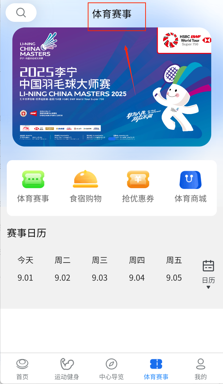 2、赛事中心板块可以浏览近期所有体育赛事安排,选择感兴趣的比赛场次进行在线购票,电子票券会自动存入我的票夹方便随时查看。