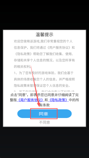1、点击“同意”按钮,接受隐私政策,开始游戏。