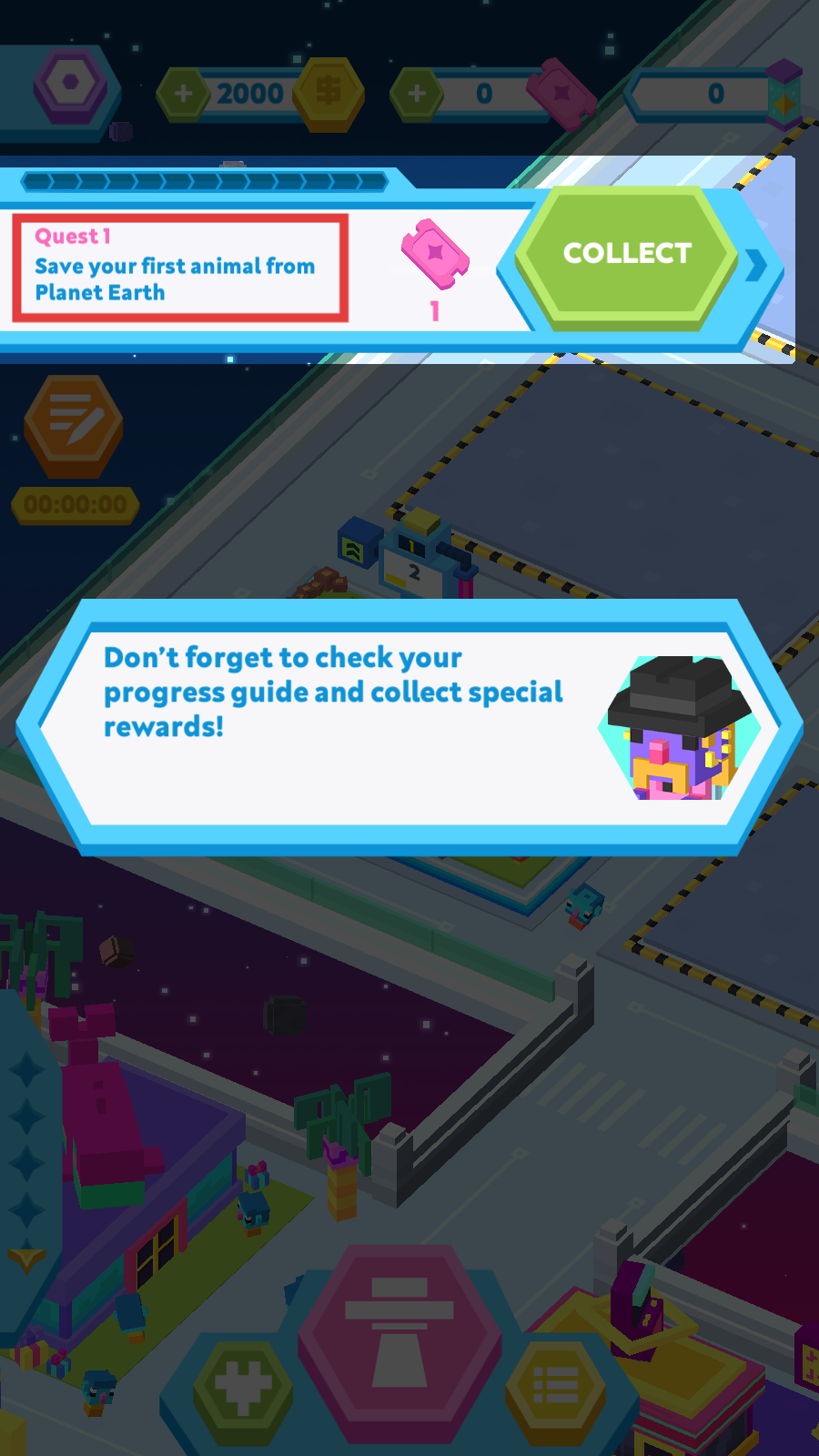 2、接取【Quest1-Save-your-first-animal-from-Planet-Earth】任务,完成后点击绿色【COLLECT】按钮,领取任务奖励。