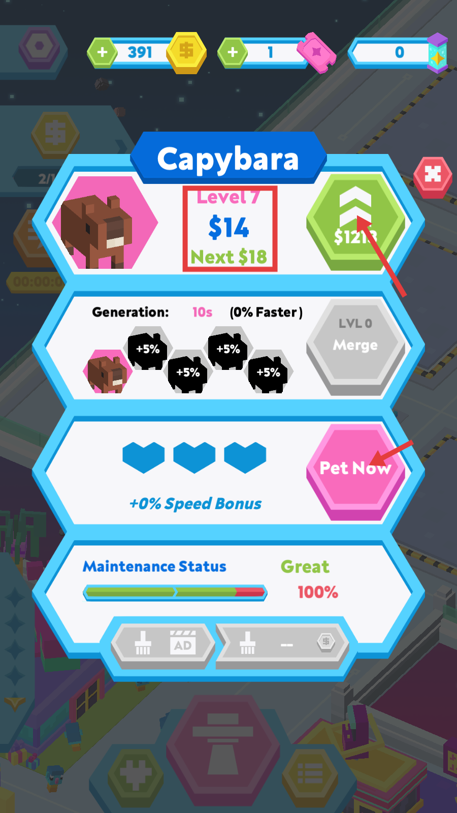 4、在动物(如Capybara)的信息界面,可点击绿色升级按钮提升等级,也能点击粉色【PetNow】按钮与动物互动。