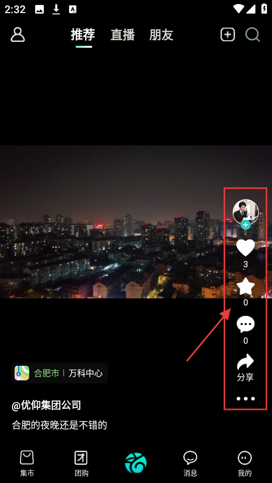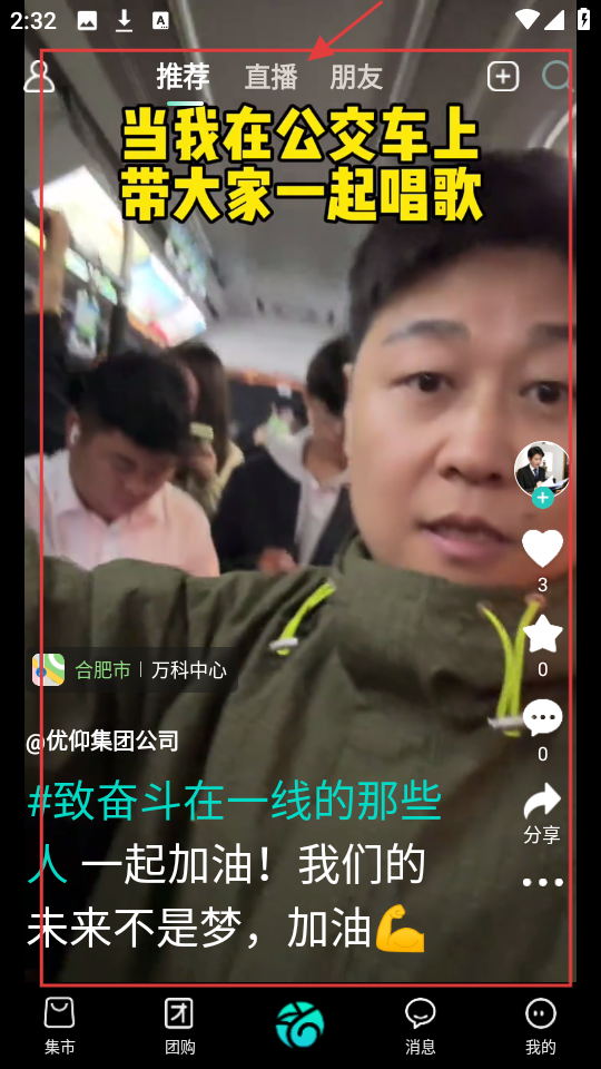 3、进入社交页面,可看到视频内容,右侧有点赞、收藏、评论、分享等功能,可与内容互动。