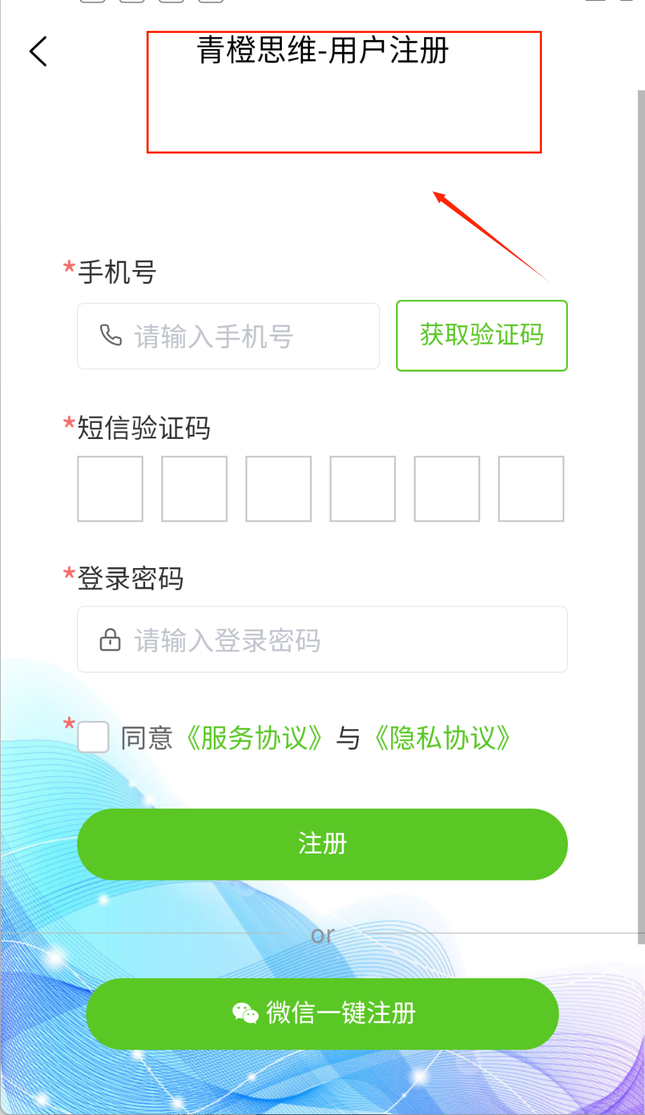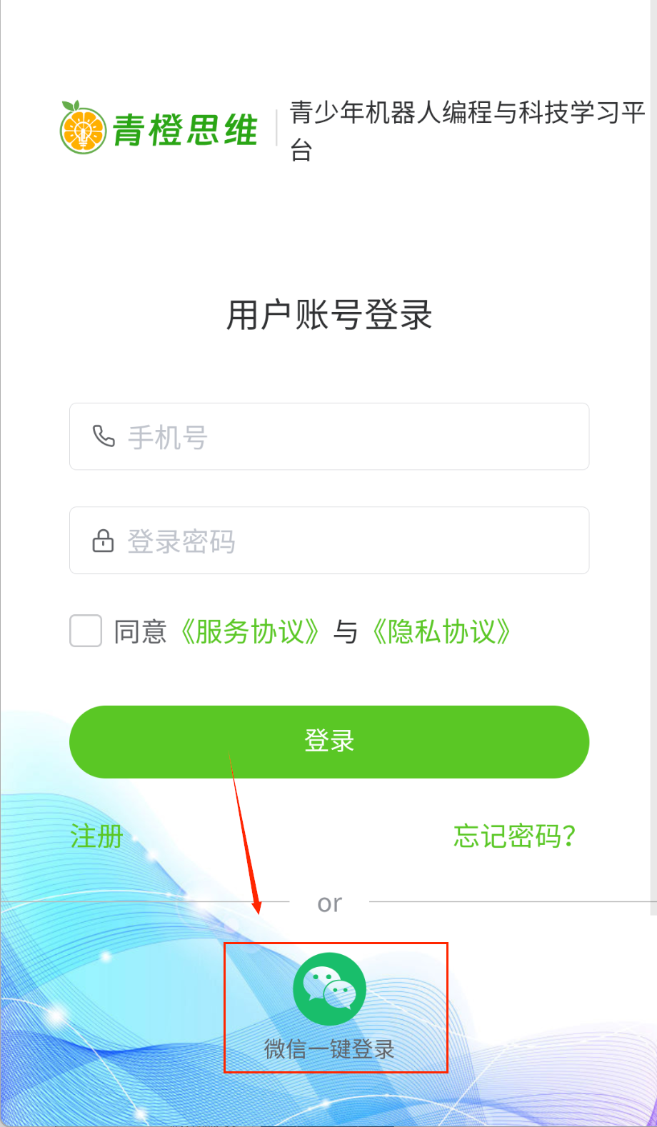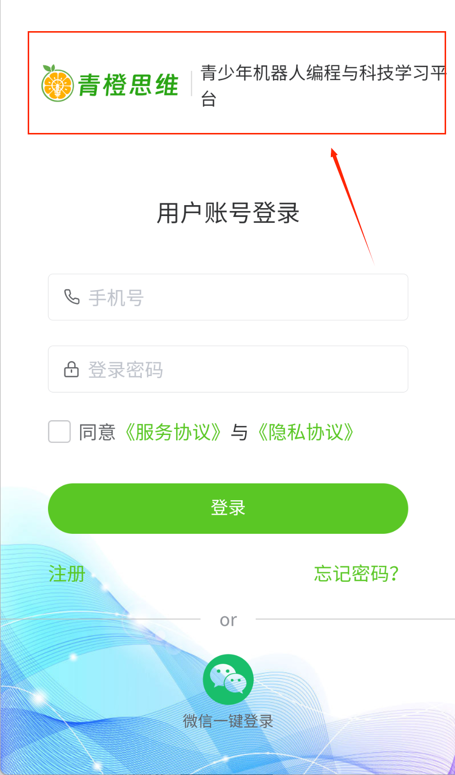 1、打开软件后首先会看到用户登录界面,最上方显示当前时间,中间有"青橙思维"的logo和平台介绍,下方排列着手机号和密码输入框填写。