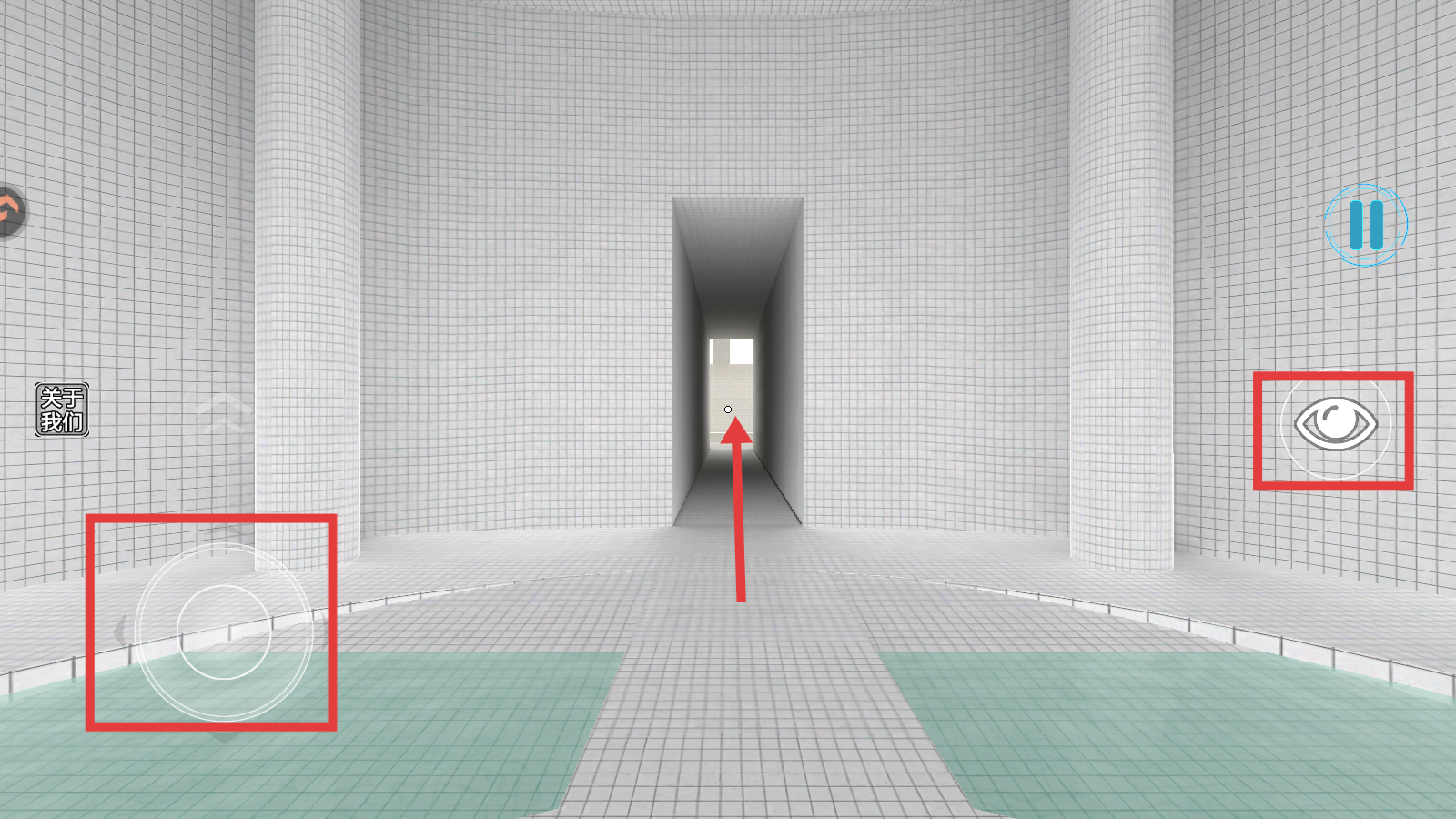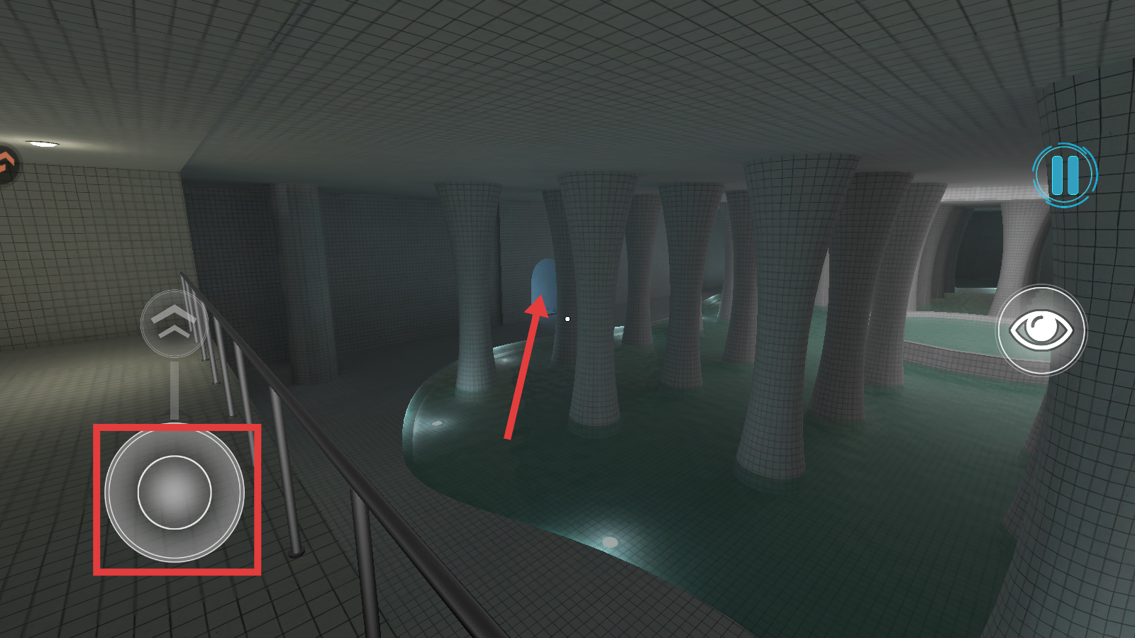 2、借助左侧摇杆移动角色,朝着前方通道行进,还可通过右侧眼睛图标观察场景。