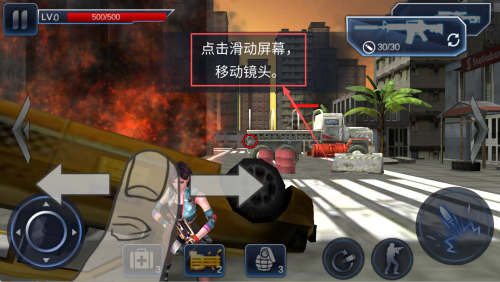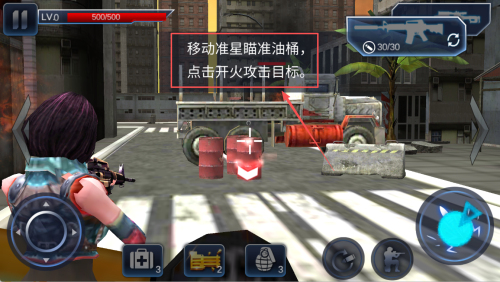 3、如何练习开火?将准星对准油桶,待提示“移动准星瞄准油桶:30/30”出现后,点击开火即可击中目标。