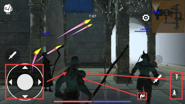 2、战斗时用左侧摇杆移动,右侧可点击攻击、跳跃、下蹲按钮,配合队友应对敌人,灵活操作很关键。