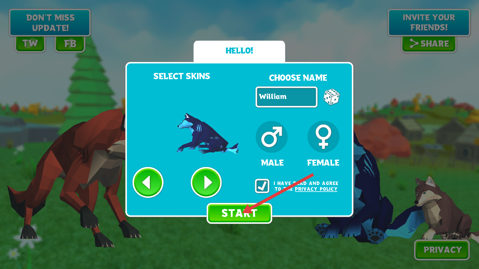 1、进入游戏先在初始界面选择【SELECTSKINS】皮肤、【CHOOSENAME】名字与性别,勾选隐私政策后点击【START】,开启冒险。