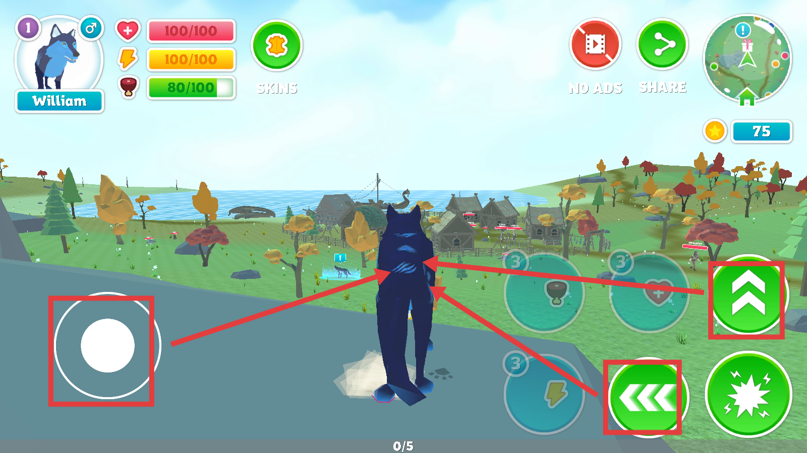 2、用左侧圆形摇杆操控角色移动,右侧【向上箭头】【多箭头】按钮分别控制前进、加速,同时留意左上角生命、体力等状态条。