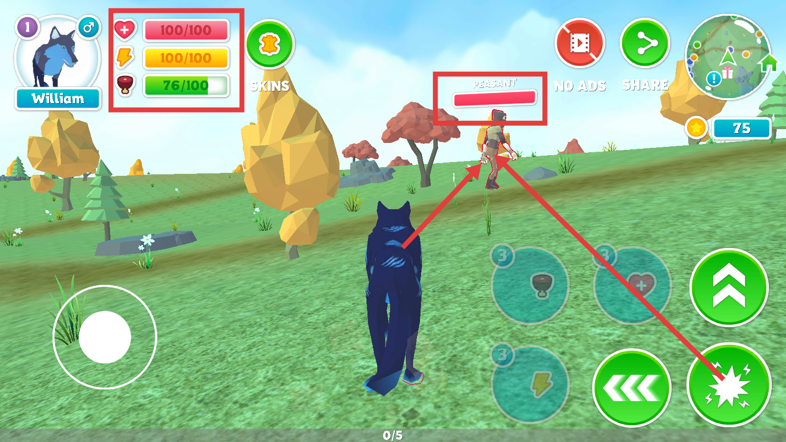 3、遇到【PEASANT】等目标时,可使用右侧技能按钮发起攻击,过程中关注自身状态数值变化,及时调整策略以防状态过低。
