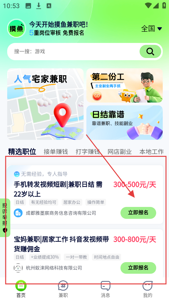 1、进入应用首页,有【人气宅家兼职】【第二份工】等板块,还有精选职位推荐,如手机转发视频短剧兼职等。