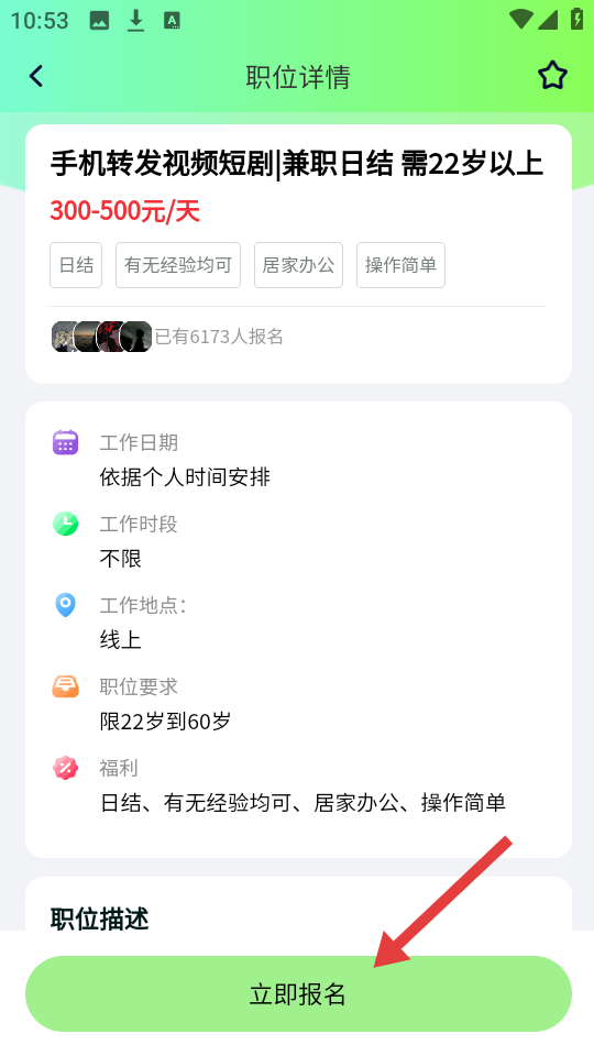 2、查看职位详情,了解工作日期、时段、地点等信息后,可点击【立即报名】。