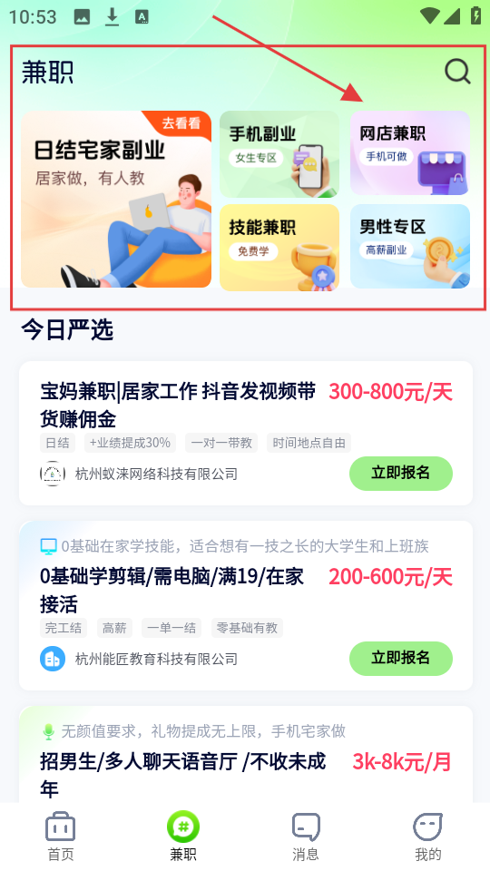 3、进入“兼职”页面,有【日结宅家副业】【手机副业】等分类,可根据需求选择不同类型的兼职。