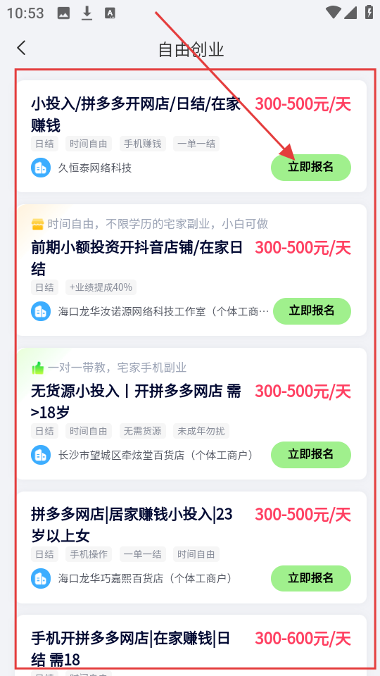 4、进入“自由创业”页面,查看创业项目,可点击【立即报名】参与相关创业项目。