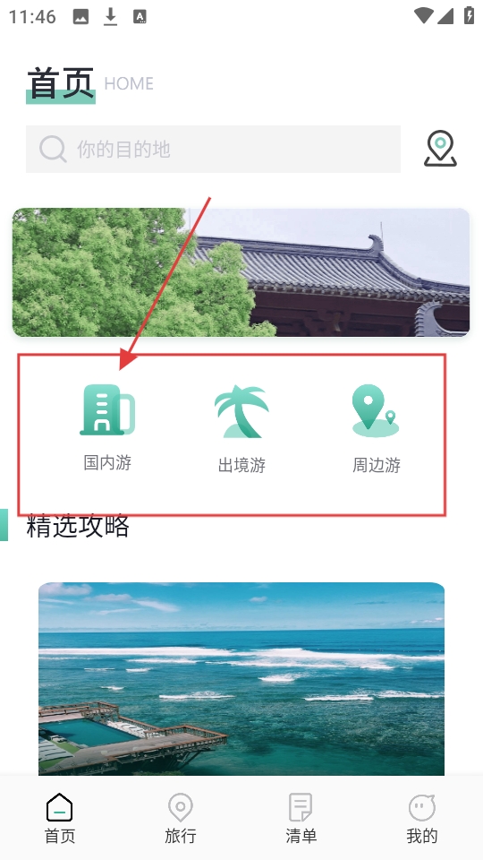 1、进入应用首页,有【国内游】【出境游】【周边游】分类,可搜索目的地,还能查看精选攻略。