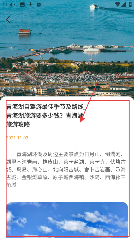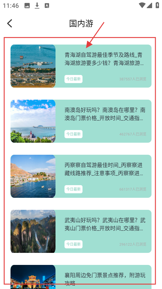 2、选择【国内游】,有青海湖、南澳岛等多地旅游攻略,可查看各攻略的浏览量等信息,挑选感兴趣的攻略。