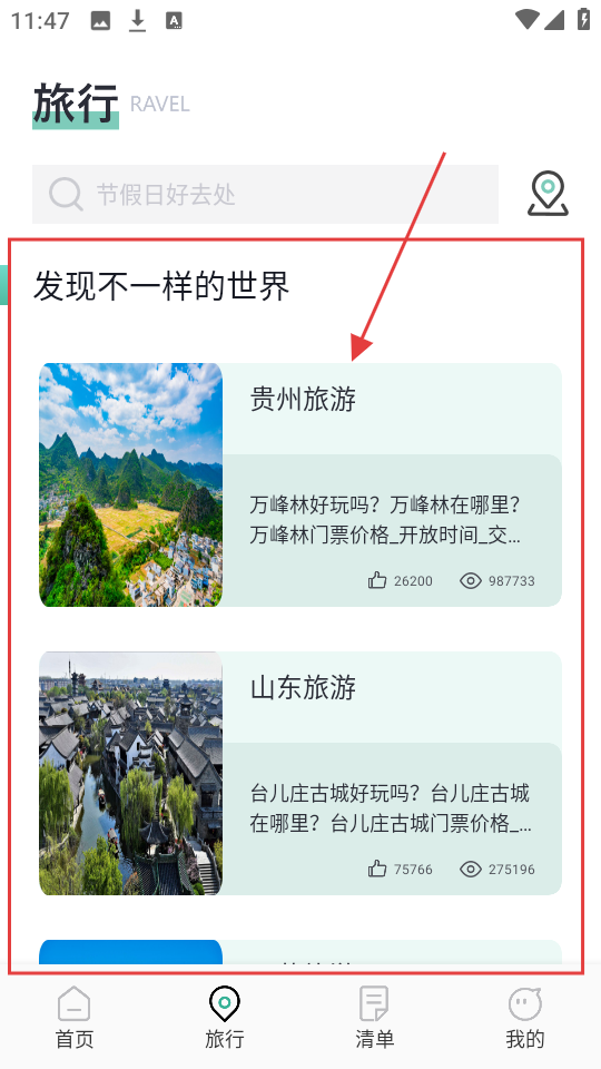 4、进入“旅行”页面,有【贵州旅游】【山东旅游】等推荐,可查看万峰林、台儿庄古城等景点相关攻略,发现不同的旅游世界。