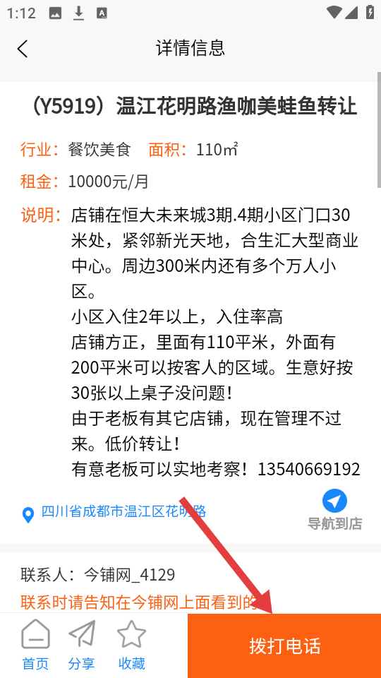 2、进入商铺详情页,查看面积、租金等信息,若有意向,点【拨打电话】联系转让方。